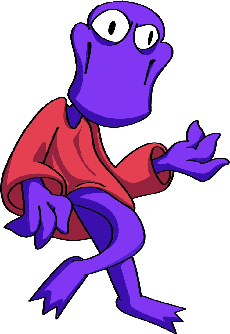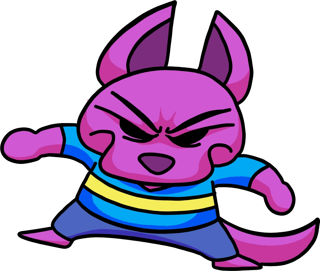 Mr. Flynet is a short, purple kangaroo with a blue and yellow striped short sleeved shirt and blue shorts, which could be interpreted as pants.