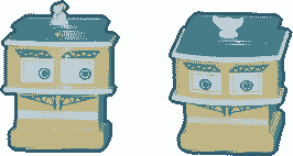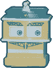 Mr. Man Protector is represented as a tan, toy building structure. His roof is a teal color and appears to have a white, spinning valve attached. His upper torso has two large, square eyes peering through with two parallelogram-shaped frames imprinted directly above, possibly meant to depict eyebrows. His lower body has two, triangular frames with a zig-zag pattern and blue, handle-like objects, likely acting as a mouth.