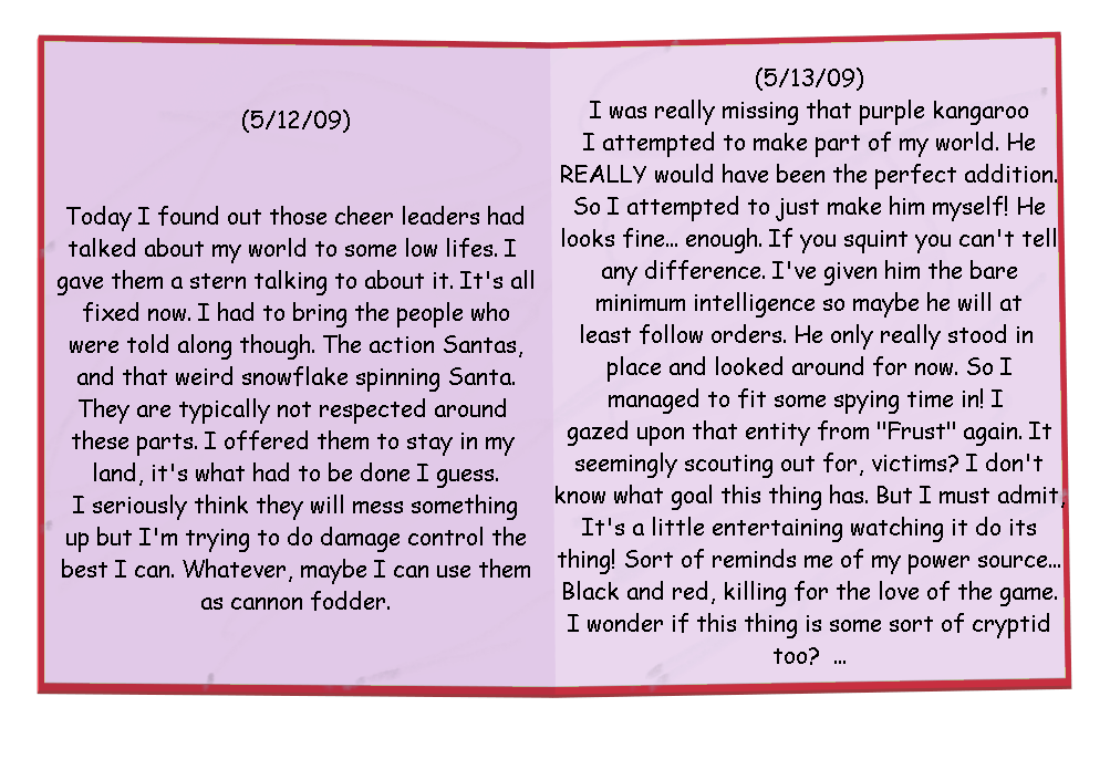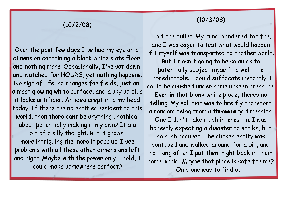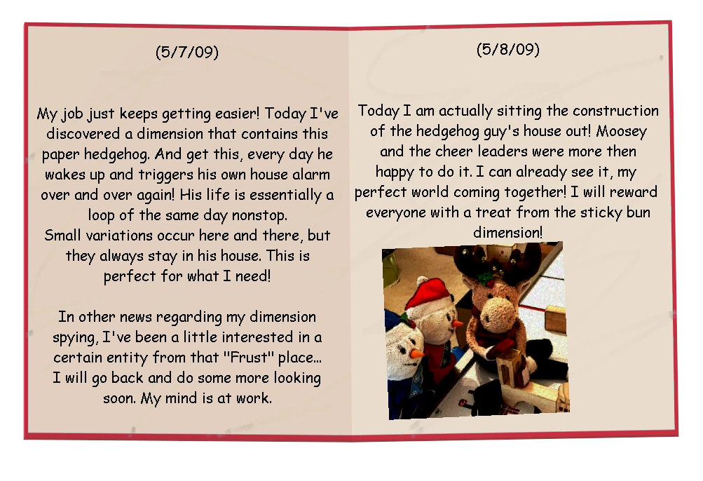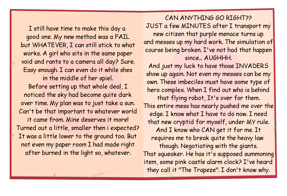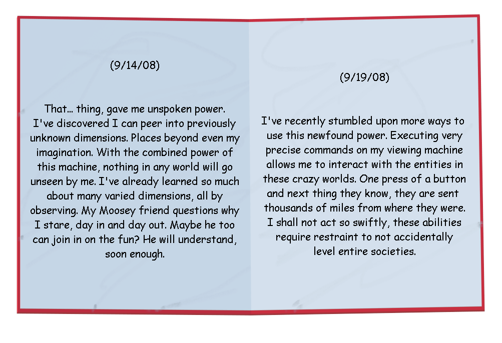 Upon advancing past the title screen for the first time, the player is greeted with The Elf's Book. This book documents the findings of The Elf, using his newfound powers acquired from Dimane to create and control a world of his very own. From the start, six pages are unlocked, and the player must complete the rest of the songs in order to uncover the rest.