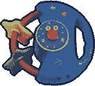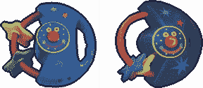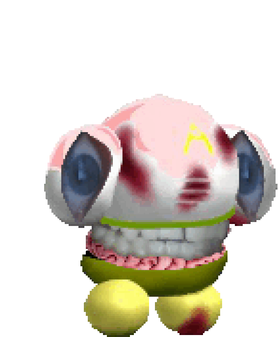 Hellao is represented as a crescent-shaped, dark blue rattle toy. His face is outlined in yellow, with a yellow sclera, green cheeks, a circular red nose, and pink lips. a red ring-like shape with yellow and green stars is attached, used to "trap" its victims.