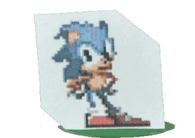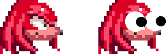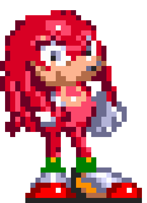Knuckles appears identical to his pixelated appearance from his original debut, being a red anthropomorphic echidna with a crescent imprint over his chest, additionally wearing spiked gloves and red shoes with extra green and yellow coloring.
