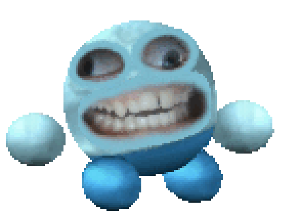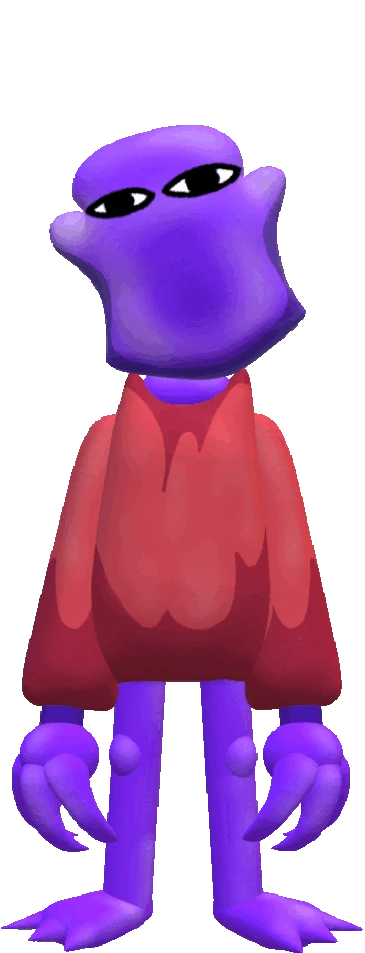 Chompo appears as a cyan "child", a Kirby-like species with round bodies and limbs. However, they differ significantly from the ones normally presented in Grab the Child, with hyper realistic textures and human-like eyes and mouth.