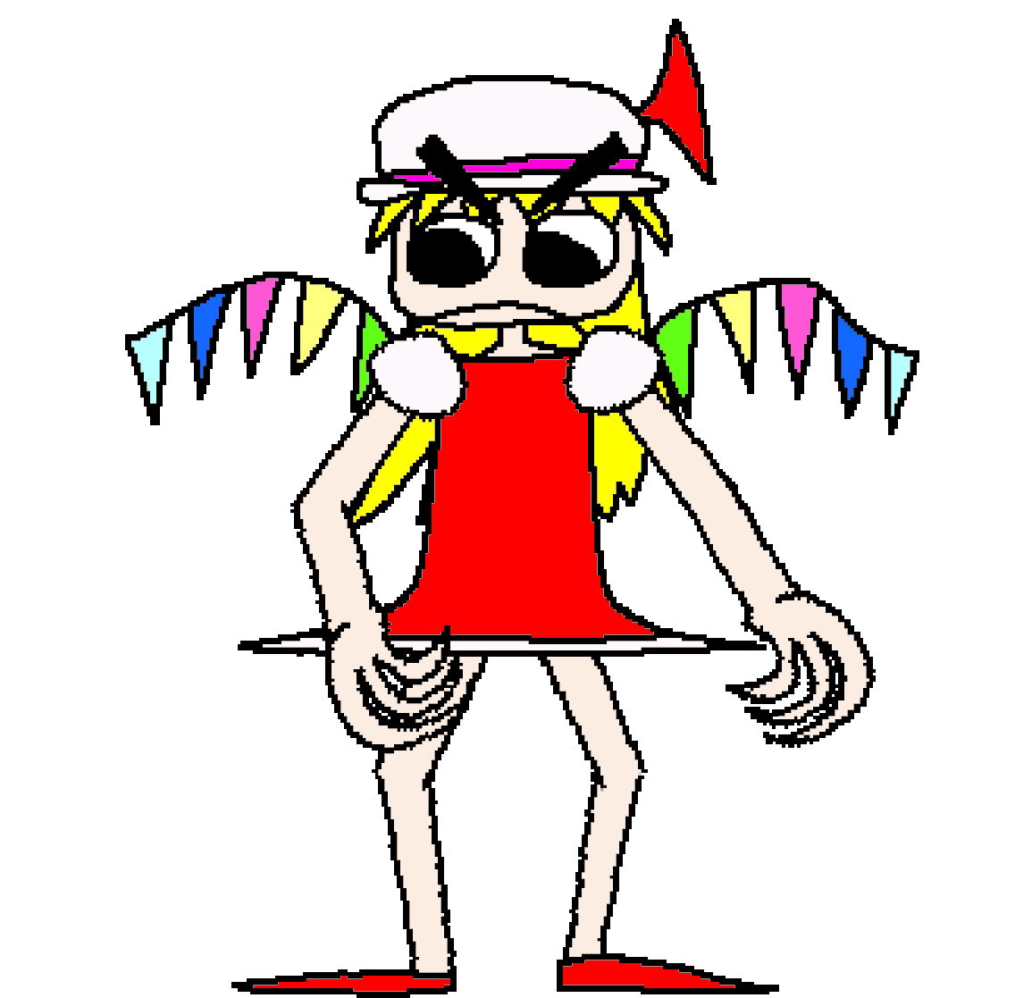 Flandre Cool Awesome is a thin, crudely drawn knock-off of Flandre Scarlet from the Touhou Project series, appearing as a light-skinned blonde-haired winged girl. She wears a white nightcap over her head, a red dress over her body, and red shoes over her feet. Sprouting from her back are black wings made up of several multicolored crystals. She is overly exaggerated in several aspects, with oversized eyeballs and long and pointy fingers.
