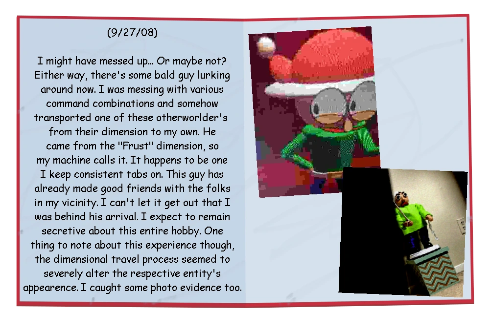 “That scoundrel came into my garden with this other small weirdo, wouldn't leave until he captured him. I would have sic'd my dogs on him but they weren't around. I attempted to scare it off myself but it's like nothing was behind those eyes. Freaked me the F*** out. I had to leave my post for once. And I feel great shame for it. Everyone including those hot dogs were gone when I came back. Mighty queer.”