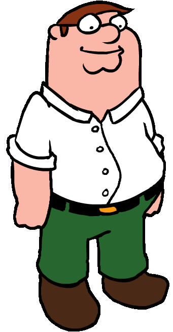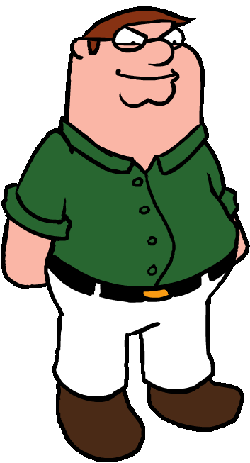 Peter Griffin is a fat, overweight guy who stands at 6'0" and weighs 270 lbs. He has short cut brown hair and a big fat head which has become one with his neck. He has big, round eyes and a round nose, and a big mouth. His chin has a very large and deep cleft in it, making the rest of his chin very big and rounded. He wears glasses which are very thin and are the exact same shape and size as his eyeballs, making them pretty invisible at most times. He wears a white buttoned shirt with a collar and slightly rolled up sleeves. He also has green pants and a black belt with a golden buckle. He also has dark brown shoes.
