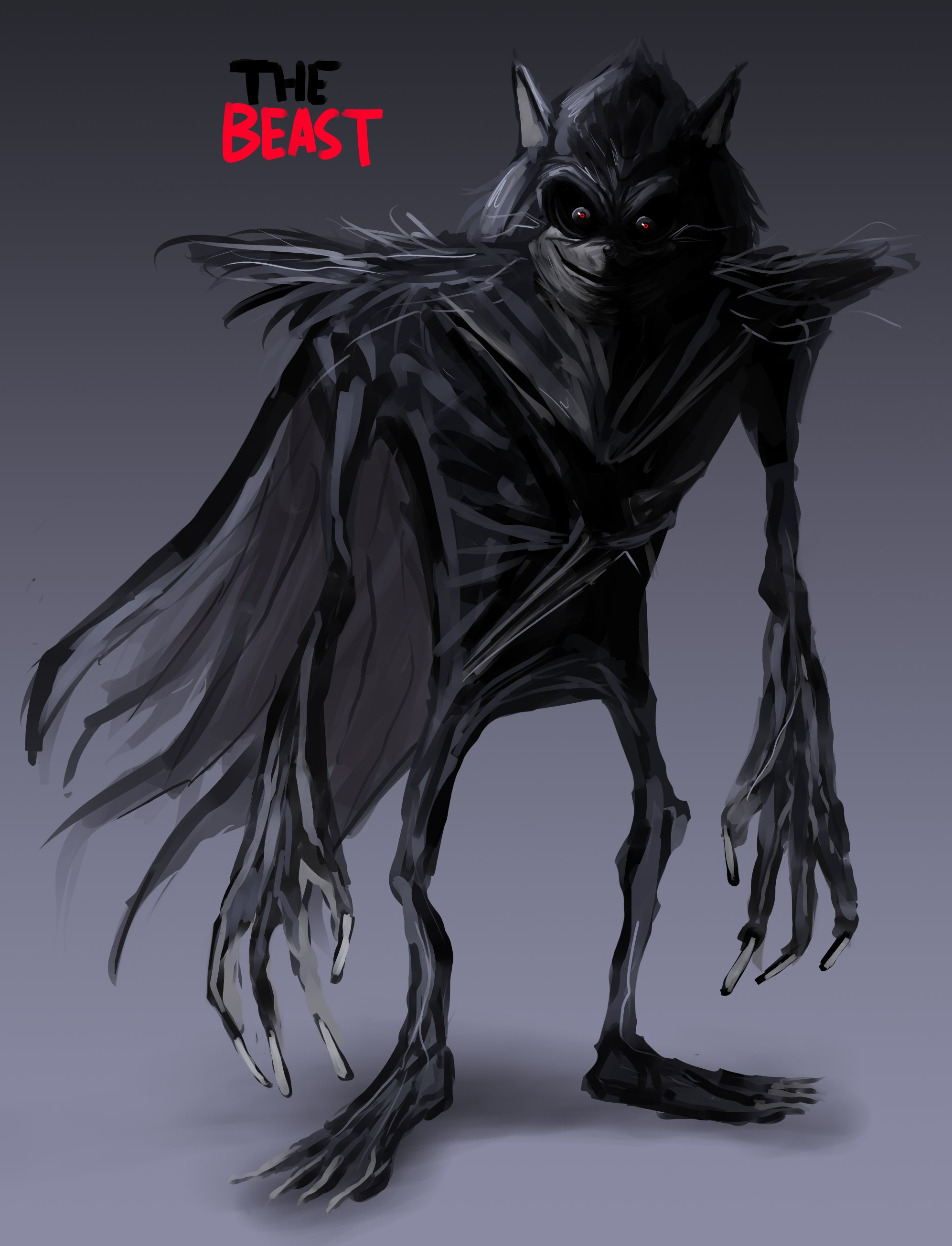 In You Can't Run, his fur is slightly darker. The sclera of his eyes are red, including his gloves and the tops of his shoes. He bears larger teeth and his gums while his lower jaw sinks into his chest, although only his gums extend.