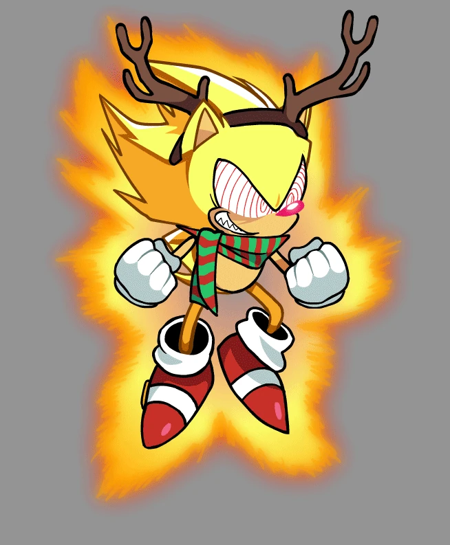 Fleetway Super Sonic appears mostly the same in this mod except being much more bright yellow and having pinkish red swirling eyes and nose. He also gains an appearance in Slaybells where he has a pair of antlers and a red and green scarf.