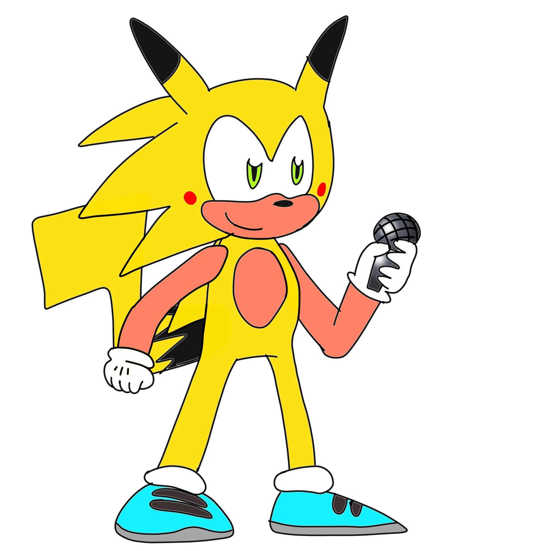 Sonichu resembles Sonic the Hedgehog, though with various characteristics of Pikachu added, such as being yellow and sporting Pikachu's tail, ears, and red cheeks. Sonichu also wears blue sneakers, rather than Sonic's usual red.