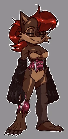 When suspected of his intentions, he transforms into a larger. more beastly form, becoming taller, having white/gray fur, red sclera and teeth, and a larger eye with a yellow iris that stares at the player. His legs are more digitigrade and his shoes emit black distortion. His white now red gloves form dead pixelated fingers and is the same with his dreadlock tips. In the uncolored sketch, he now appears to have black sections before his feet and hands.