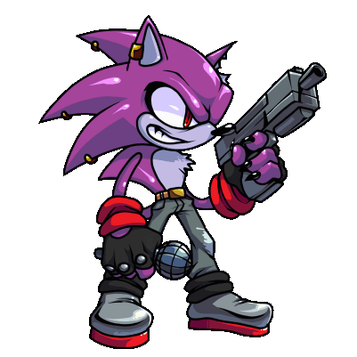 He had a scrapped design where it was copied over Shadow's sprites from Friday Night Funkin' Sonic's Rhythm Rush, even down to the gun. The only difference this design has is that he has a torn ear.