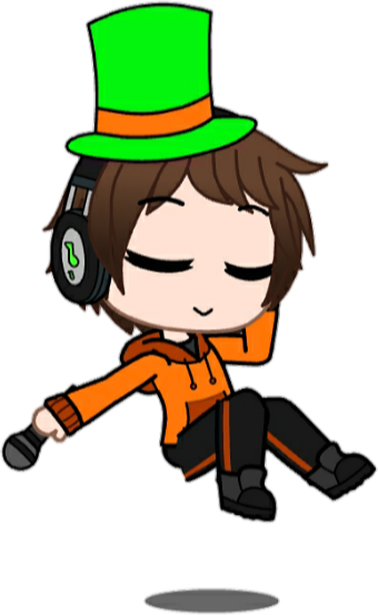 His clothes are an orange hoodie, black pants, and gray shoes, he also wears headphones and a green top hat.