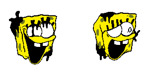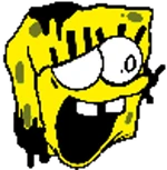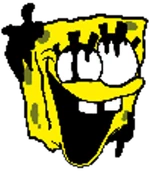 Spongebob is yellow Sponge. He has a brown suit with black stripes and a red tie. He has white socks with black shoes. He has a spatula in his left hand.