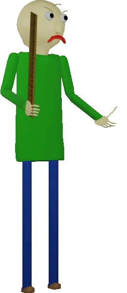 Baldi is a tall, skinny Caucasian male with a spherical head, red lips, and a single strand of hair coming out of his scalp. He wears a green shirt, blue jeans, pale brown shoes, and holds a ruler in his right hand. He is also portrayed as a three-dimensional figure as opposed to hand-drawn sprites to illustrate his origins from a 3D game.