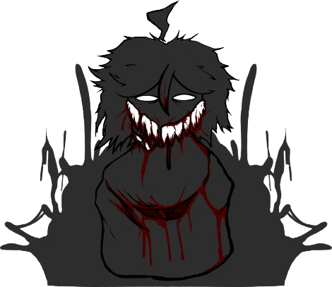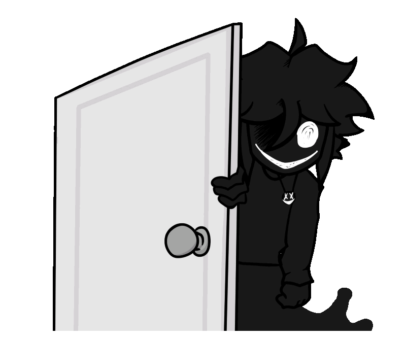 Otherside appears as a shadowy apparition looking similar to Brightside. His body is pitch black, with a single glowing eye and crooked smile. The lower half of his body appears to be fluid, akin to a ghost. During Negoation he emerges from a door, peeking inside through it. During Deathbed, he is covered in blood with a cut across his torso. He also gains sharp, bloodied teeth, and two glowing eyes instead of the singular eye.