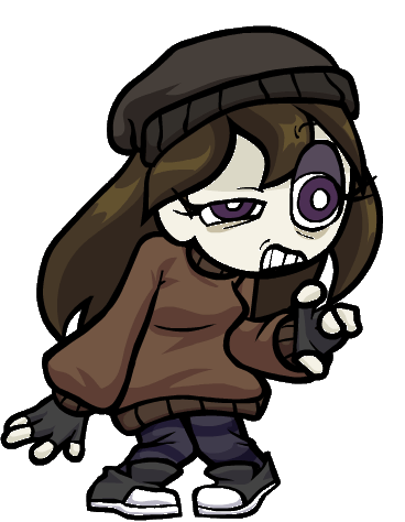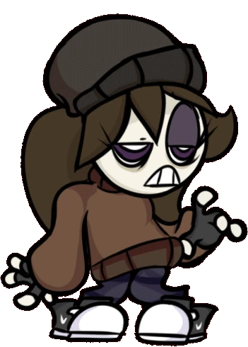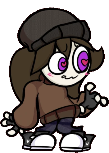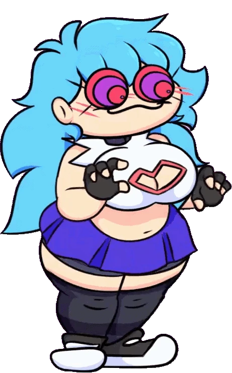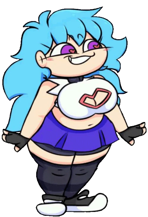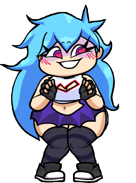 In her (now outdated) Raised form, her appearance changes drastically to a tall, pudgy far cry from her former self. Her messy brown hair turns a bright blue to match Boyfriend's, with pink blush marks present on both cheeks and a much rounder facial structure. Her purple retinas become more saturated, with her white pupils replaced with magenta hearts, along with her mascara becoming much more pronounced. Instead of her hoodie from before, she wears a choker around her neck and a white sleeveless top, the sleeves seeming to be torn off. A checkmark-shaped hole with red lining is seen on her top, almost resembling a heart. At her waist she sports an indigo skirt, with dark grey shorts underneath. Lastly, she wears the same striped thigh-highs, sneakers and fingerless gloves from her NEET form.