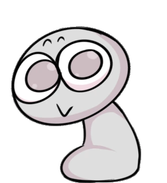 His design is very simple, being a short grey humanoid with a bean body and circle head. He has two small eyebrows, large beady eyes with grey pupils and a cartoony mouth.